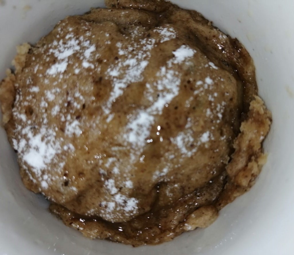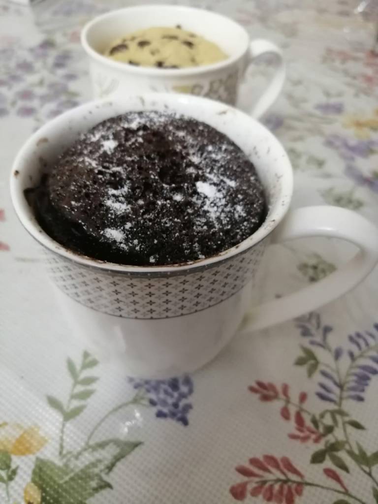 Put all the ingredients in a mug as mentioned above then mix it properly. You can add chocolate chips if you want. Put the mug in the microwave for about 1 minute. I used it for a 1000 watt microwave. You can adjust the timing according to your microwave. Sprinkle some powdered sugar on it or you can enjoy it with a scoop of vanilla ice-cream to your heart’s content.
